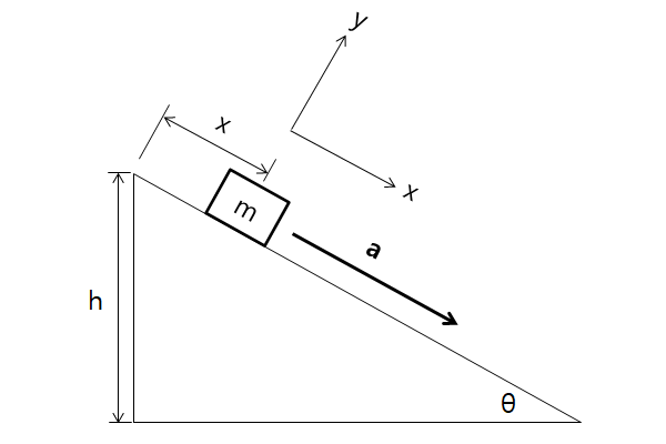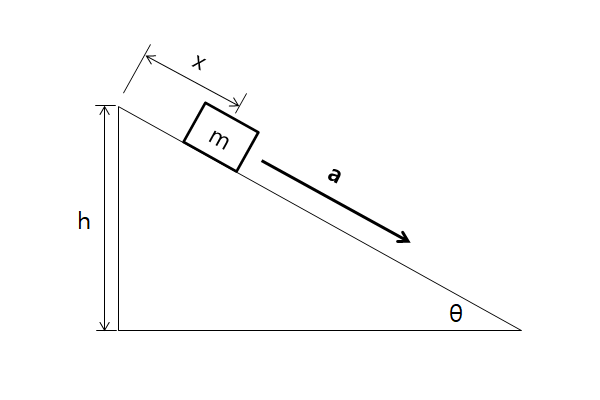 그림에서와 같이 수평으로 θ각도로 기울어진 부드럽고 마찰이 없는 평면을 자유롭게 미끄러져 내려갈 수 있는 블록을 생각해 봅시다. 평면의 높이가 h이고 블록이 상단의 정지 상태에서 시작하는 경우, 바닥까지 도달했을 때 그 속도는 얼마가 될 것인가?